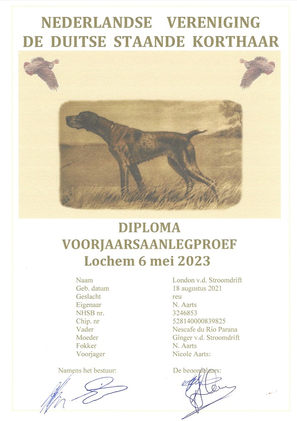 Tijdens de NVDSK Voorjaarsaanlegproef in Lochem hebben de broers Luxor en London v.d. Stroomdrift het bevestigingscertificaat ontvangen. Een geslaagde dagen voor onze kennel en natuurlijk ook de bazen.